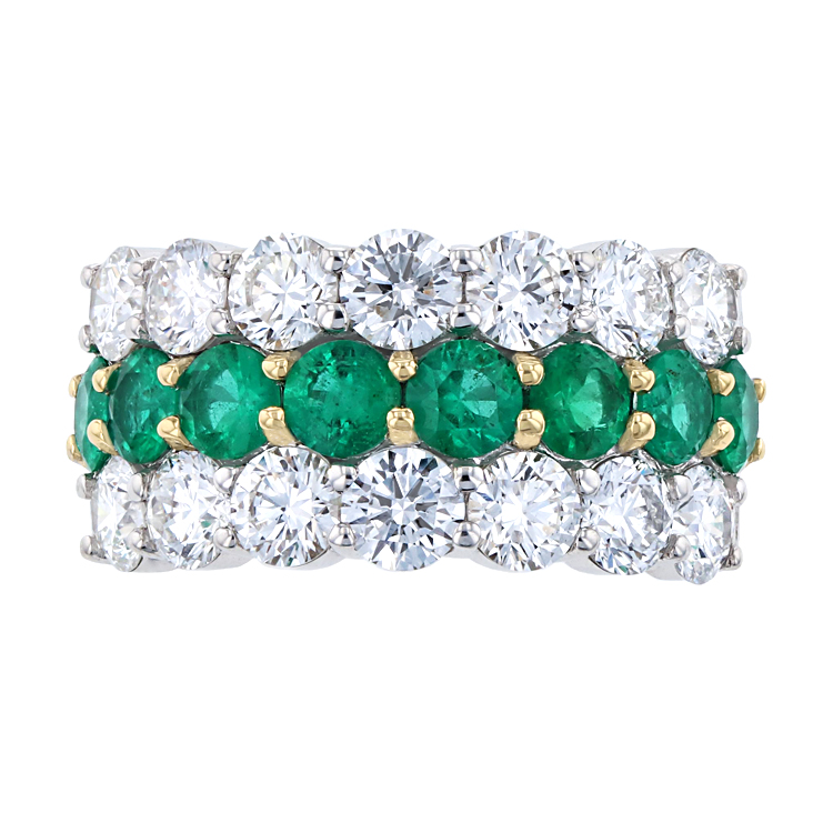 Featuring 1.10cttw Emerald in center row with 2.43cttw F VS1 Diamonds in the outside rows set in 18k Yellow Gold and 18k White Gold